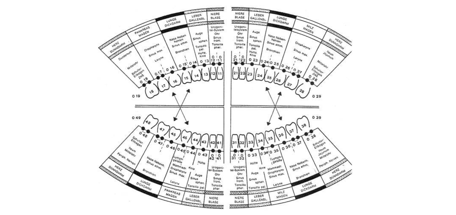 Dr. Voll und Dr. Kramer haben die Zusammenhänge zwischen den einzelnen Zähnen, den Meridianen und den zugehörigen Organsystemen erforscht und ein Übersichtsschema verfasst.